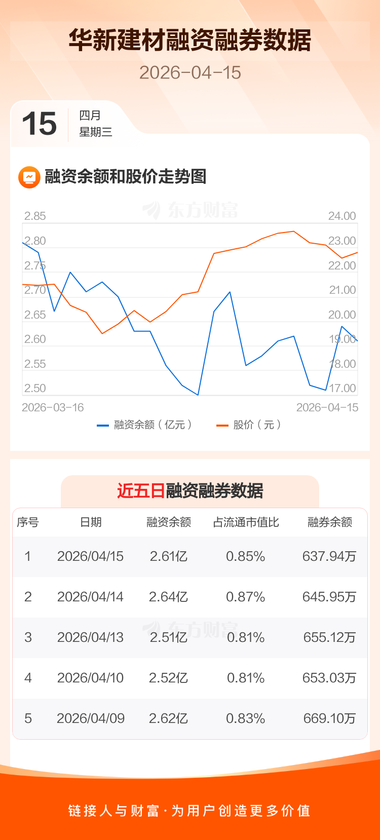 交易所最新数据显示,华新建材于2026年4月15日获融资买入2114.49万元,融资偿还2415.52万元,当日融资净偿还301.04万元。目前,该股融资余额2.61亿,占流通市值比例为0.85%。