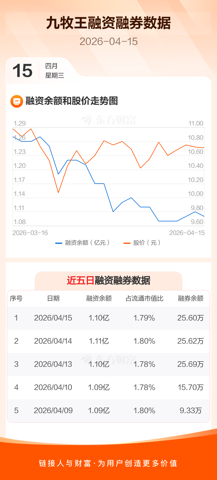 交易所最新数据显示,九牧王于2026年4月15日获融资买入579.30万元,融资偿还677.42万元,当日融资净偿还98.12万元。目前,该股融资余额1.10亿,占流通市值比例为1.79%。