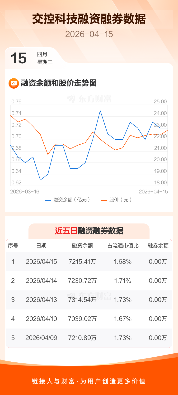 交易所最新数据显示,交控科技于2026年4月15日获融资买入452.80万元,融资偿还468.11万元,当日融资净偿还15.3万元。目前,该股融资余额7215.41万,占流通市值比例为1.68%。