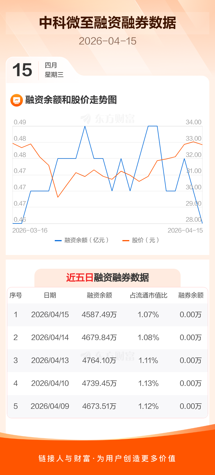 交易所最新数据显示,中科微至于2026年4月15日获融资买入42.88万元,融资偿还135.24万元,当日融资净偿还92.35万元。目前,该股融资余额4587.49万,占流通市值比例为1.07%。