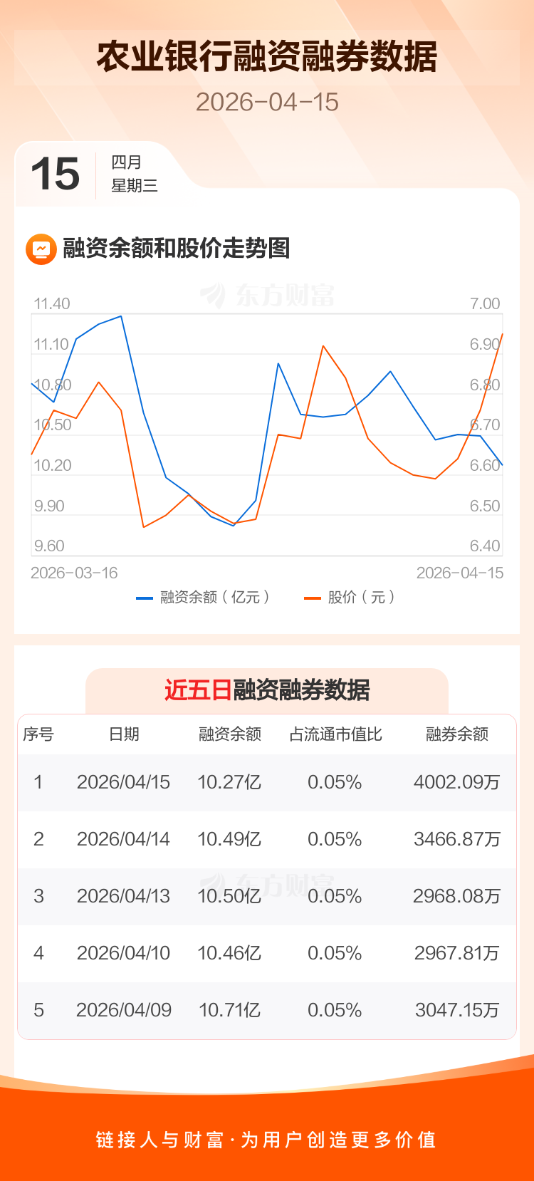 交易所最新数据显示,农业银行于2026年4月15日获融资买入1.93亿元,融资偿还2.16亿元,当日融资净偿还2245.2万元。目前,该股融资余额10.27亿,占流通市值比例为0.05%。