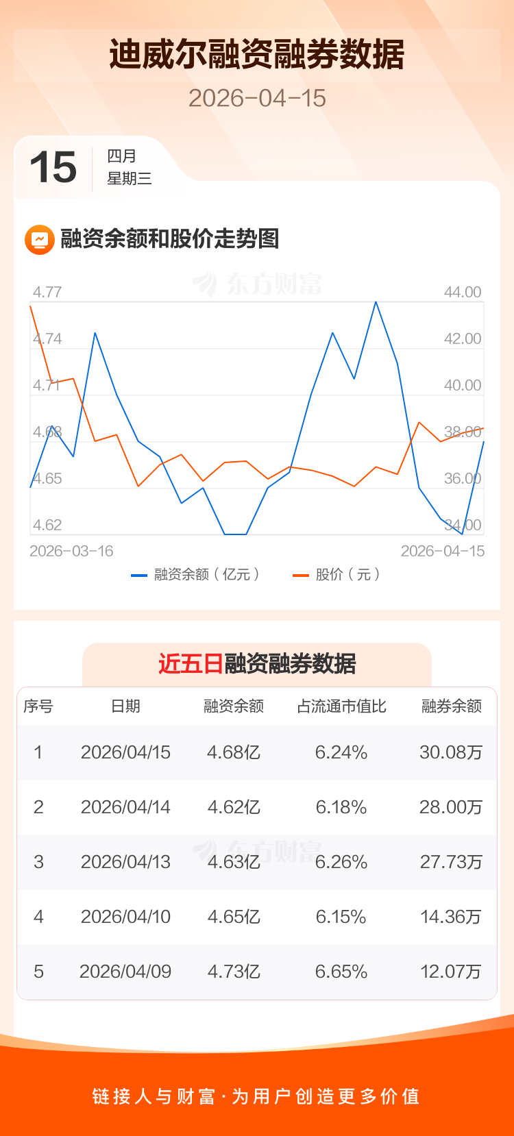 交易所最新数据显示,迪威尔于2026年4月15日获融资买入1184.83万元,融资偿还520.95万元,当日融资净买入663.87万元。目前,该股融资余额4.68亿,占流通市值比例为6.24%。