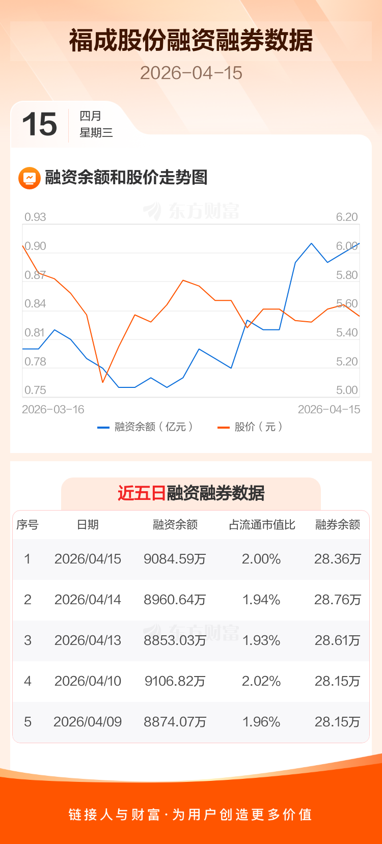 交易所最新数据显示,福成股份于2026年4月15日获融资买入581.67万元,融资偿还457.72万元,当日融资净买入123.95万元。目前,该股融资余额9084.59万,占流通市值比例为2.00%。