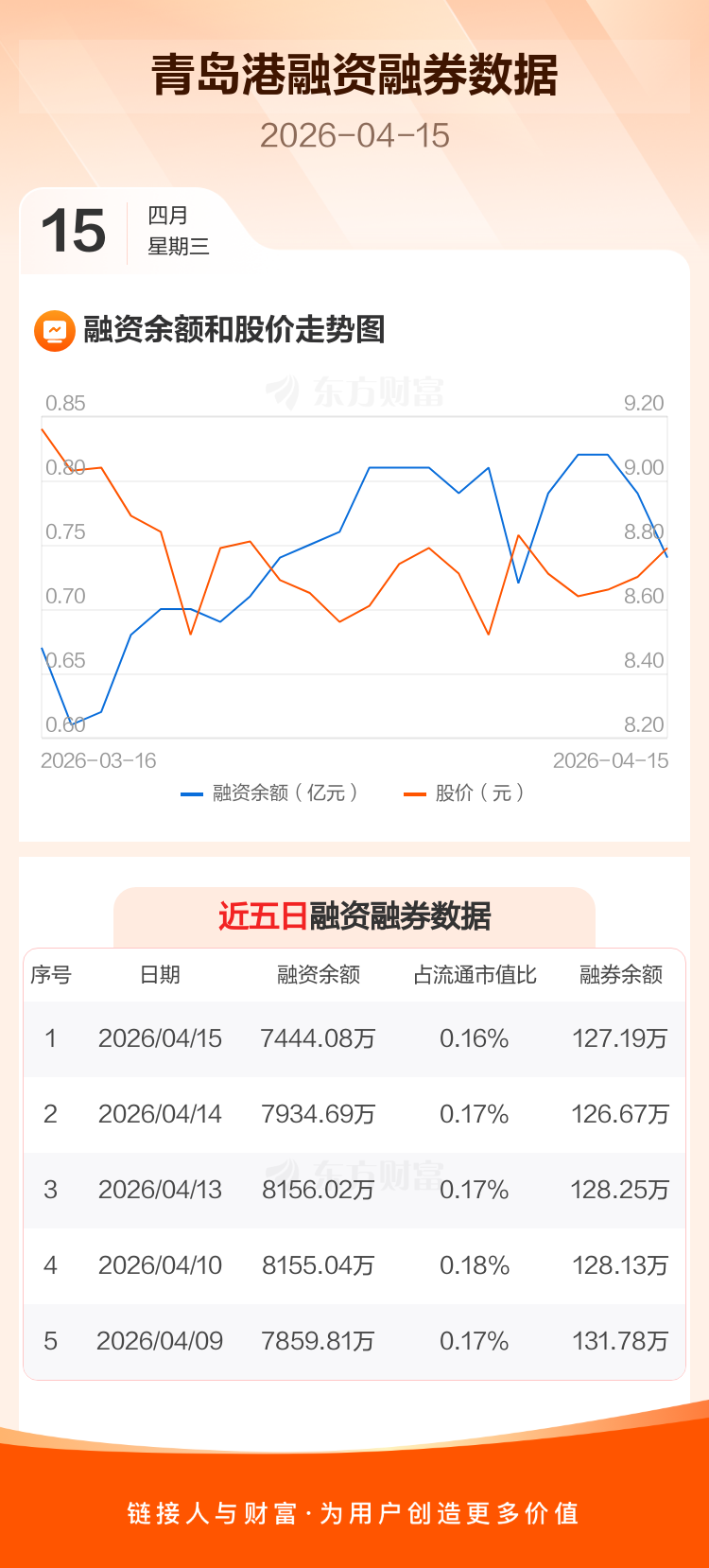 交易所最新数据显示,青岛港于2026年4月15日获融资买入245.78万元,融资偿还736.39万元,当日融资净偿还490.61万元。目前,该股融资余额7444.08万,占流通市值比例为0.16%。