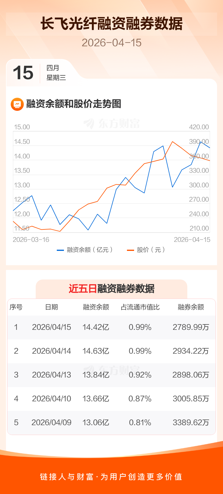 交易所最新数据显示,长飞光纤于2026年4月15日获融资买入5.02亿元,融资偿还5.23亿元,当日融资净偿还2097.87万元。目前,该股融资余额14.42亿,占流通市值比例为0.99%。