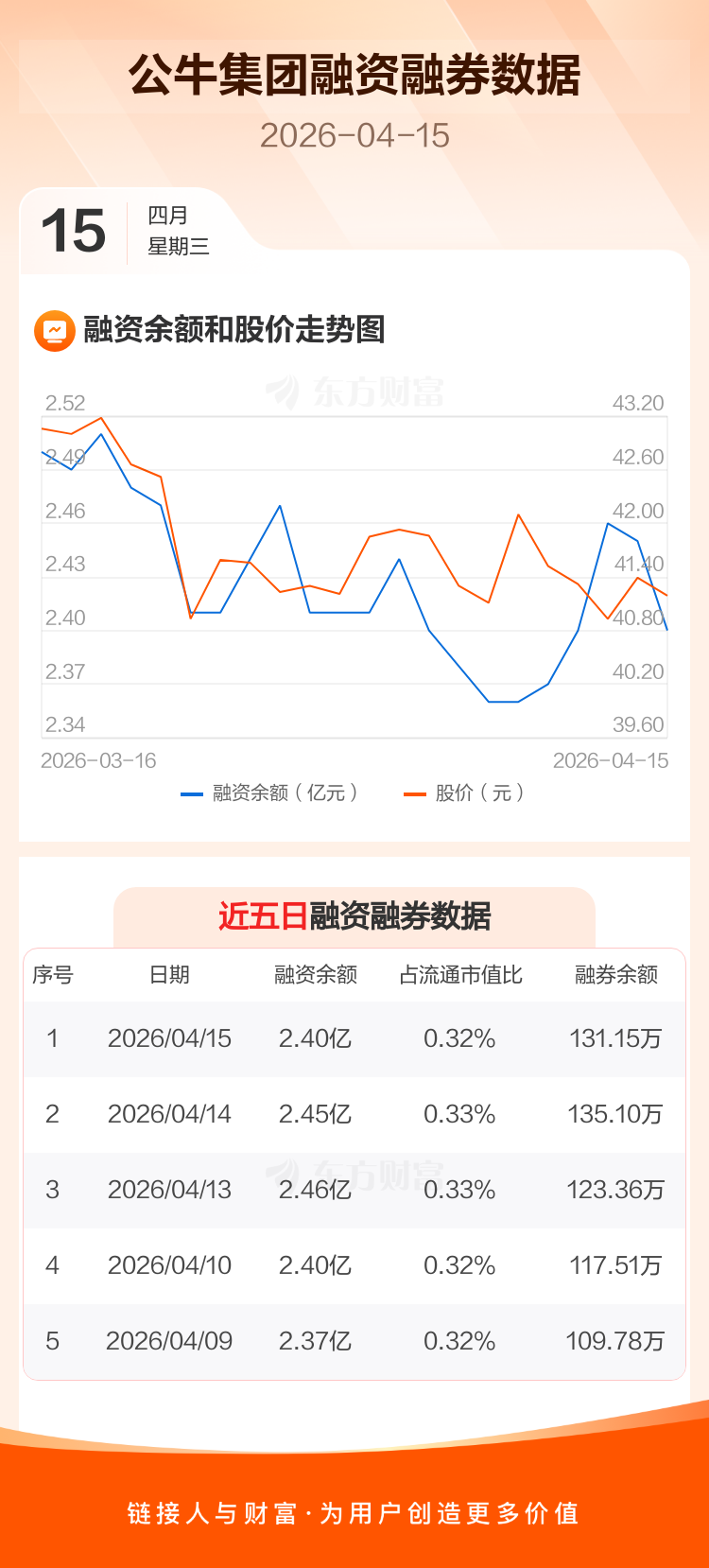 交易所最新数据显示,公牛集团于2026年4月15日获融资买入259.45万元,融资偿还726.90万元,当日融资净偿还467.45万元。目前,该股融资余额2.40亿,占流通市值比例为0.32%。