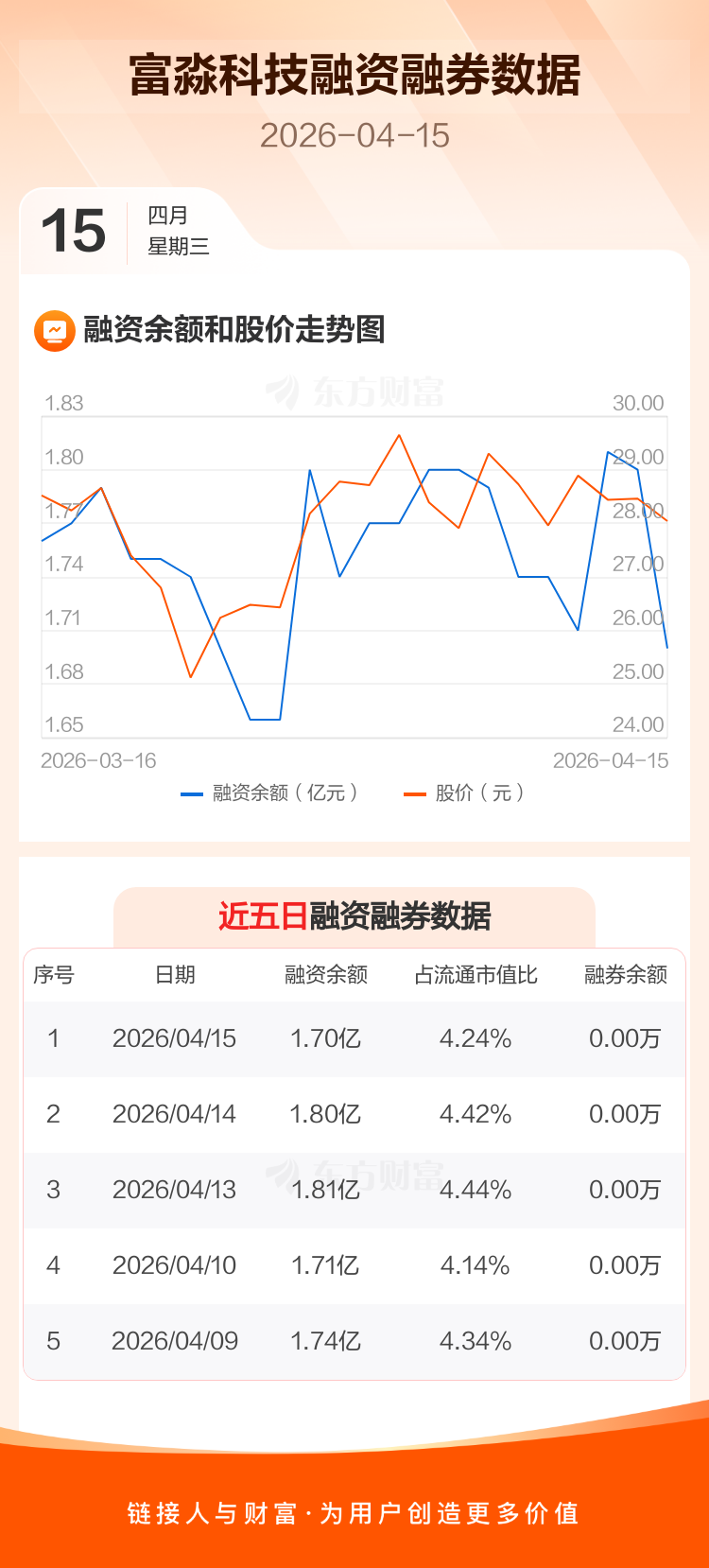 交易所最新数据显示,富淼科技于2026年4月15日获融资买入923.80万元,融资偿还1878.49万元,当日融资净偿还954.69万元。目前,该股融资余额1.70亿,占流通市值比例为4.24%。