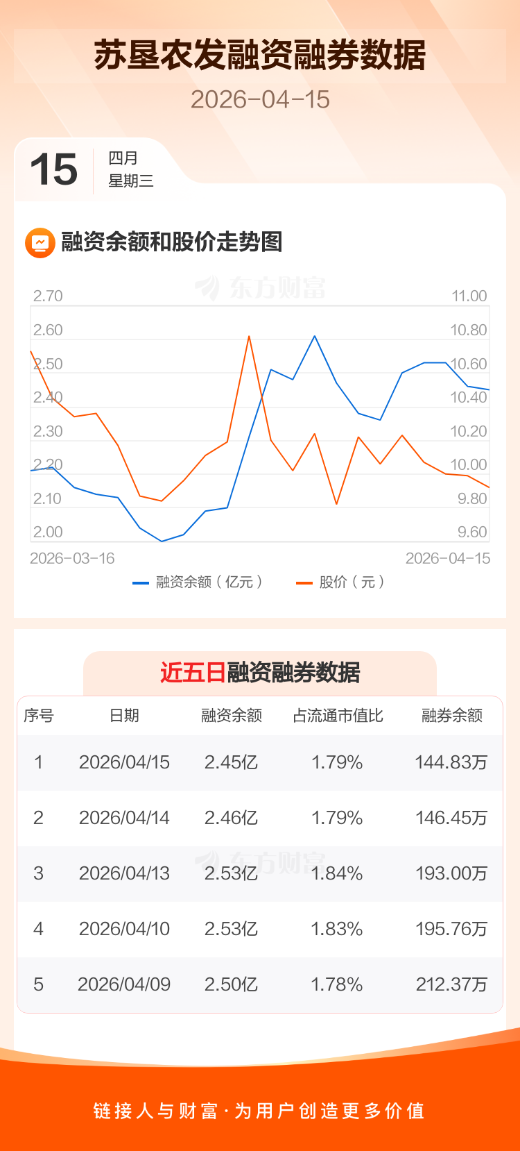 交易所最新数据显示,苏垦农发于2026年4月15日获融资买入1773.09万元,融资偿还1913.80万元,当日融资净偿还140.71万元。目前,该股融资余额2.45亿,占流通市值比例为1.79%。