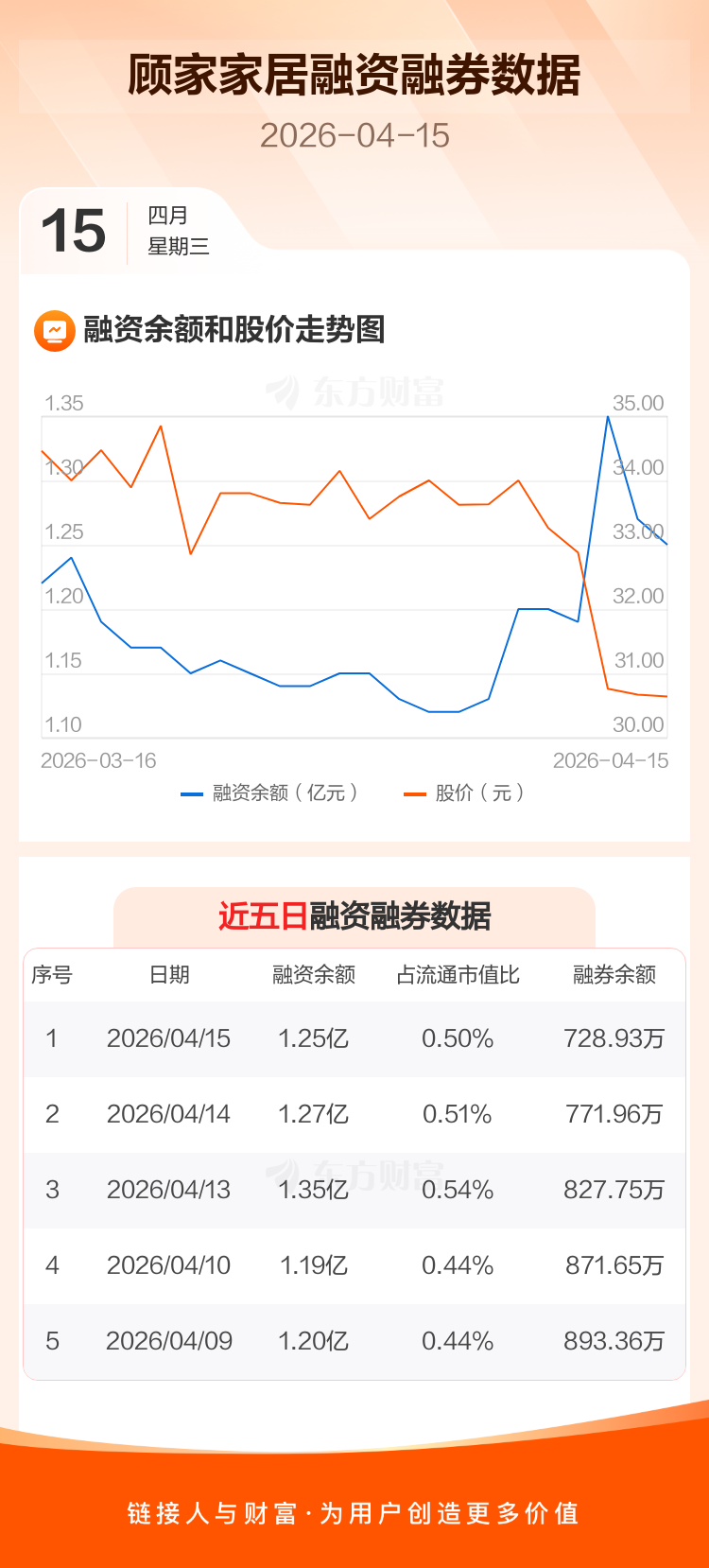 交易所最新数据显示,顾家家居于2026年4月15日获融资买入806.51万元,融资偿还1018.94万元,当日融资净偿还212.43万元。目前,该股融资余额1.25亿,占流通市值比例为0.50%。