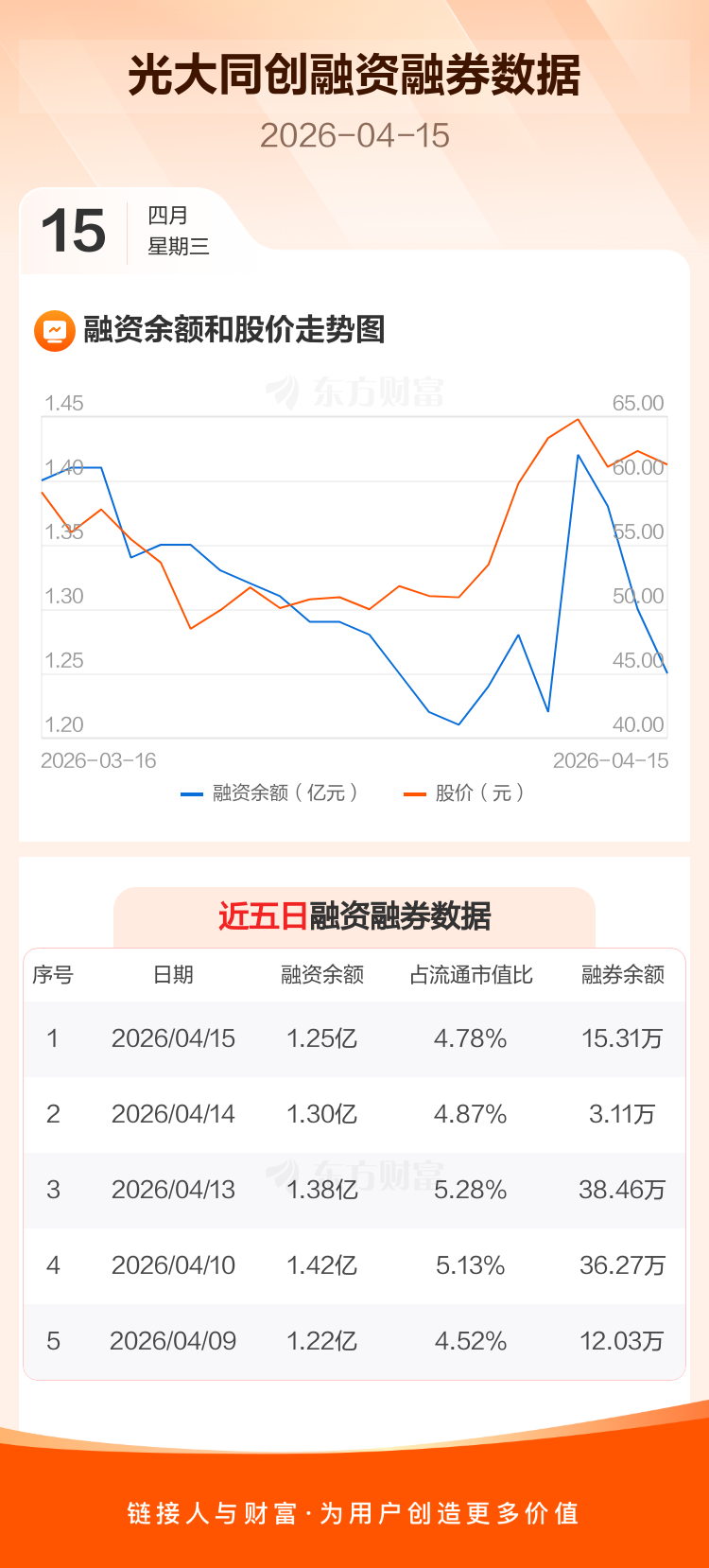 交易所最新数据显示,光大同创于2026年4月15日获融资买入1255.69万元,融资偿还1732.81万元,当日融资净偿还477.12万元。目前,该股融资余额1.25亿,占流通市值比例为4.78%。