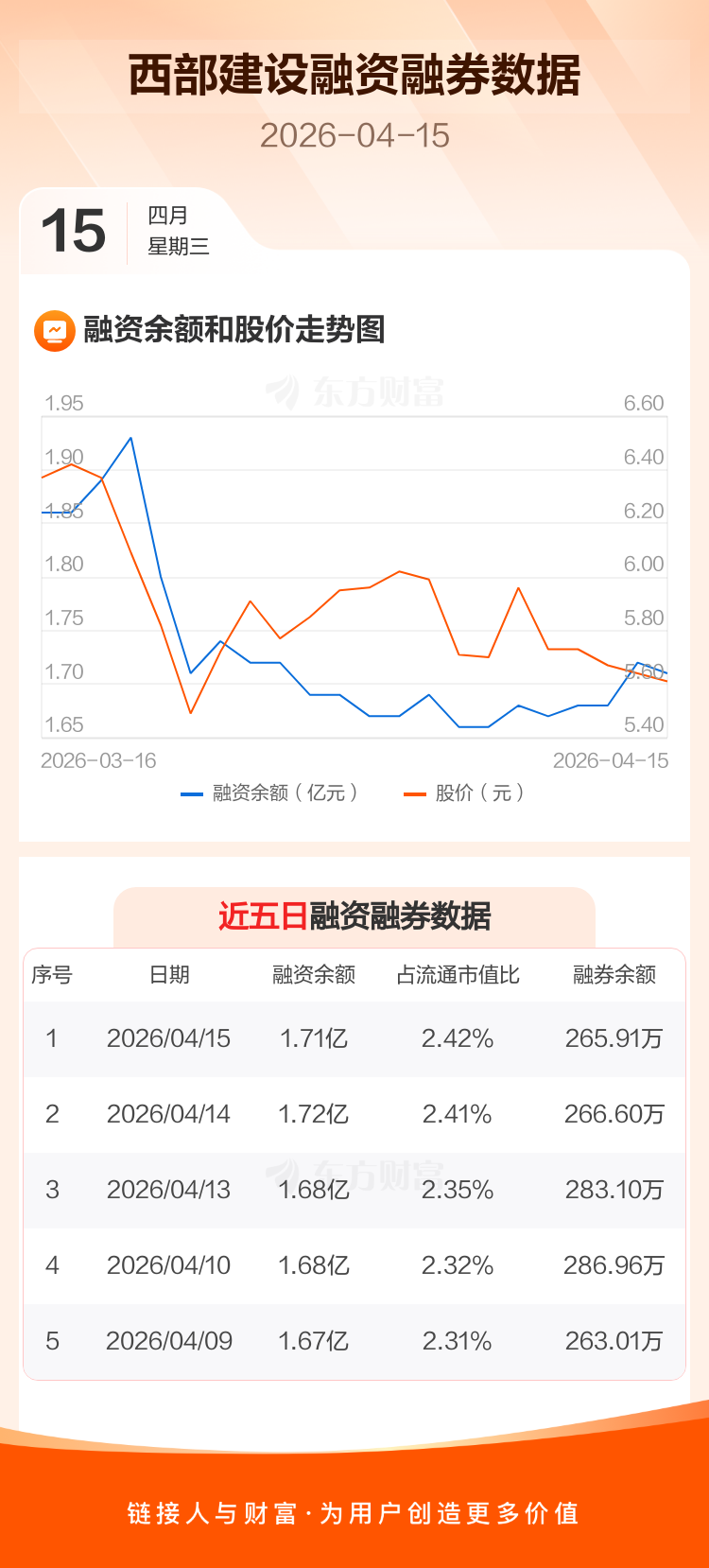 交易所最新数据显示,西部建设于2026年4月15日获融资买入347.92万元,融资偿还354.55万元,当日融资净偿还6.63万元。目前,该股融资余额1.71亿,占流通市值比例为2.42%。