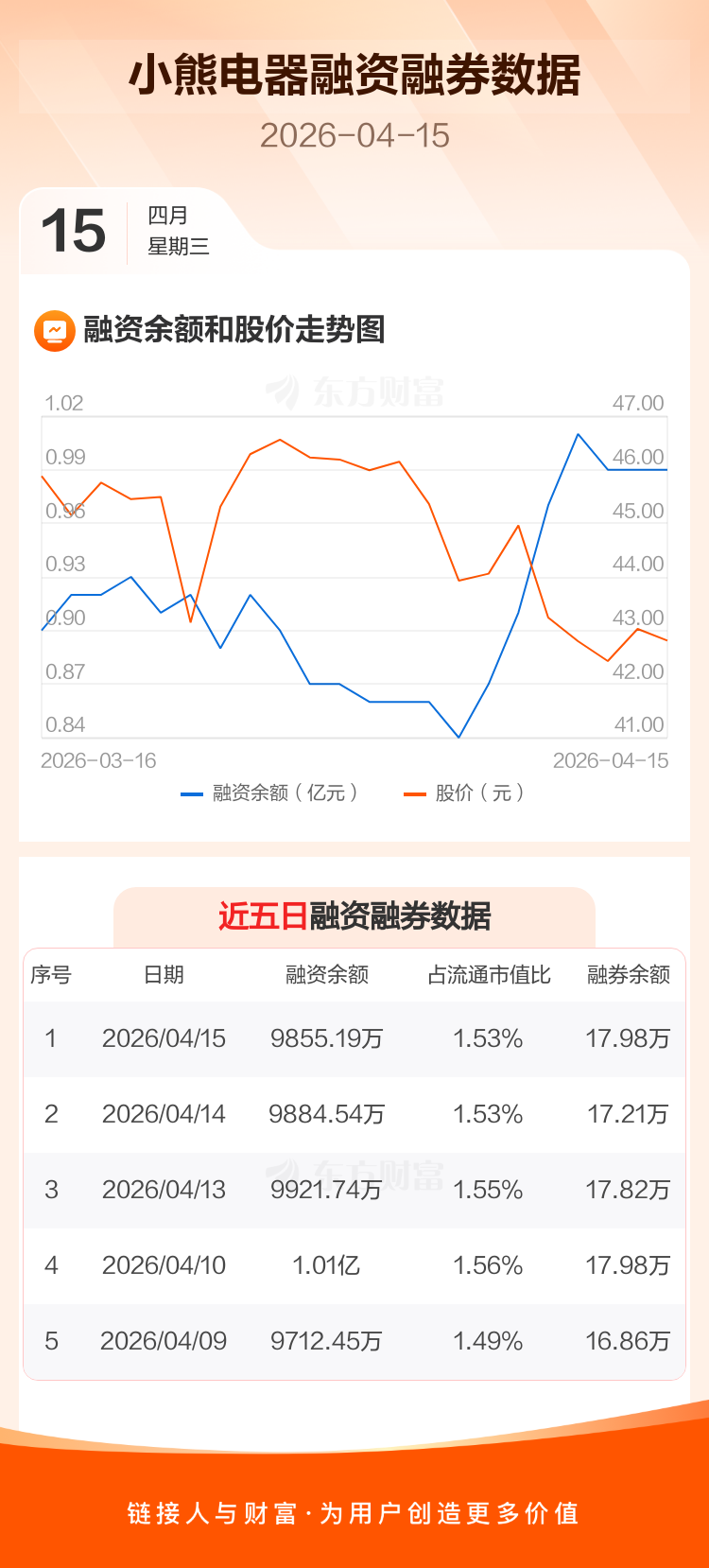 交易所最新数据显示,小熊电器于2026年4月15日获融资买入581.17万元,融资偿还610.52万元,当日融资净偿还29.35万元。目前,该股融资余额9855.19万,占流通市值比例为1.53%。