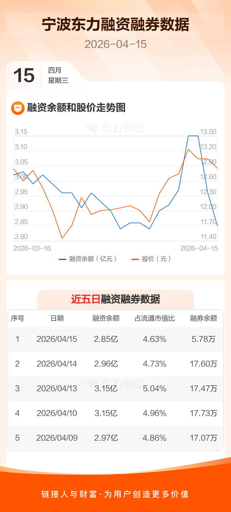 交易所最新数据显示,宁波东力于2026年4月15日获融资买入1427.08万元,融资偿还2457.16万元,当日融资净偿还1030.09万元。目前,该股融资余额2.85亿,占流通市值比例为4.63%。