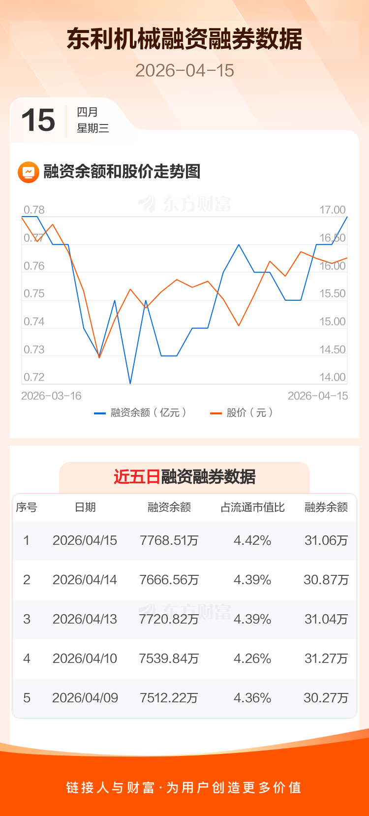 交易所最新数据显示,东利机械于2026年4月15日获融资买入740.06万元,融资偿还638.10万元,当日融资净买入101.95万元。目前,该股融资余额7768.51万,占流通市值比例为4.42%。