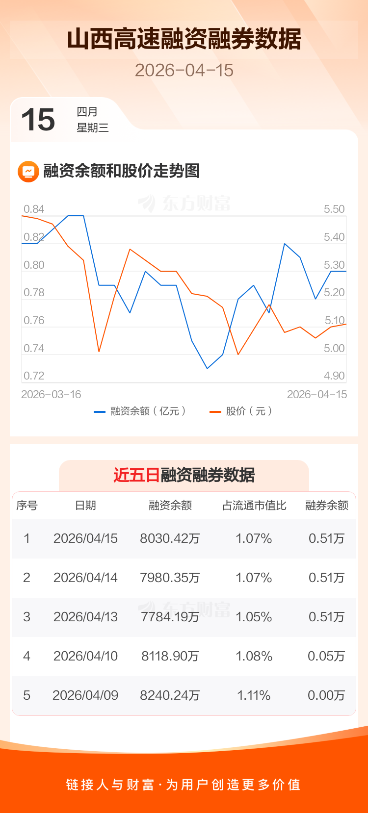 交易所最新数据显示,山西高速于2026年4月15日获融资买入227.71万元,融资偿还177.64万元,当日融资净买入50.07万元。目前,该股融资余额8030.42万,占流通市值比例为1.07%。