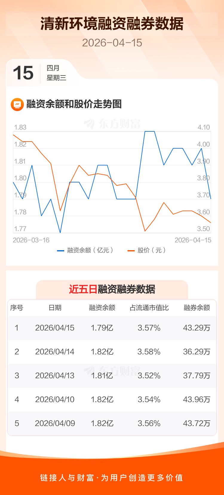 交易所最新数据显示,清新环境于2026年4月15日获融资买入376.05万元,融资偿还648.32万元,当日融资净偿还272.27万元。目前,该股融资余额1.79亿,占流通市值比例为3.57%。