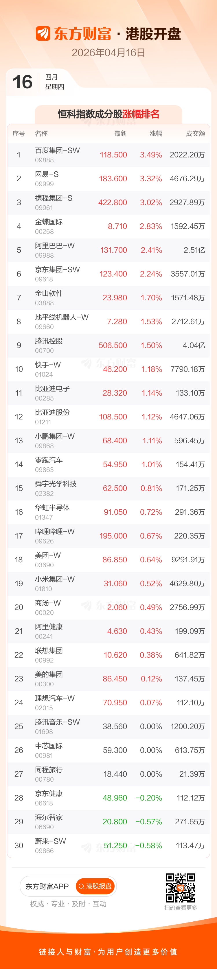 港股4月16日高开,恒生指数开盘报26122.8点,涨175.48点,涨幅0.68%;恒生科技指数开盘报4976.17点,涨64.38点,涨幅1.31%。恒生指数成分股中新东方-S、宁德时代、百度集团-SW涨幅居前,中国石油股份、九龙仓置业、吉利汽车跌幅靠前。恒生科技指数成分股中百度集团-SW、网易-S、携程集团-S涨幅居前,蔚来-SW、海尔智家、京东健康跌幅靠前。