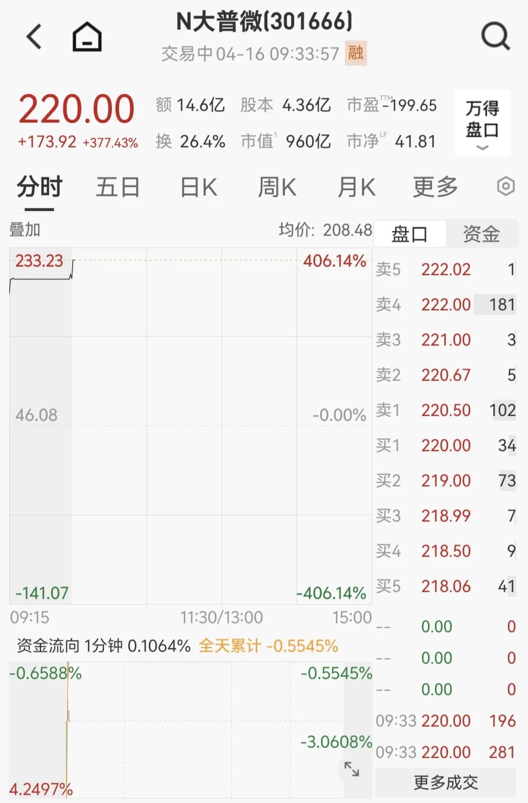 上市首日,大普微股价大幅高开,一度狂飙406.14%。截至记者发稿,大普微报220.00元/股,涨377.43%。