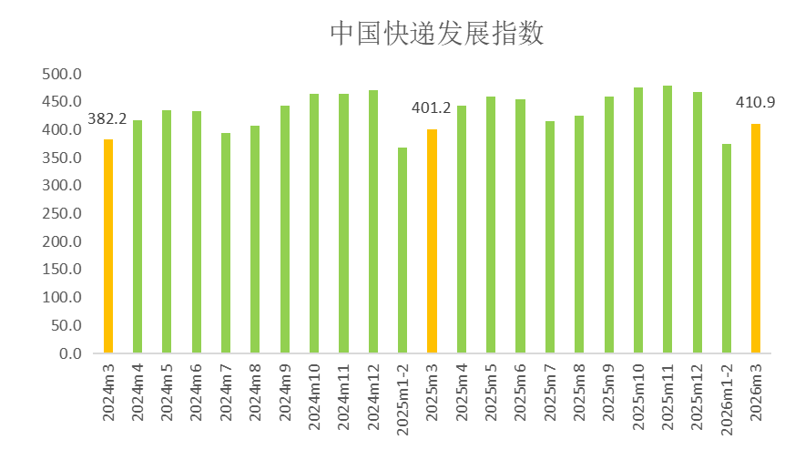 新华财经北京4月16日电(记者刘旭阳、李唐宁)16日,国家邮政局发布2026年3月中国快递发展指数报告。经测算,2026年3月中国快递发展指数为410.9,同比提升2.4%。一季度,快递业务量预计同比增长6%,快递业务收入预计同比增长6.5%。