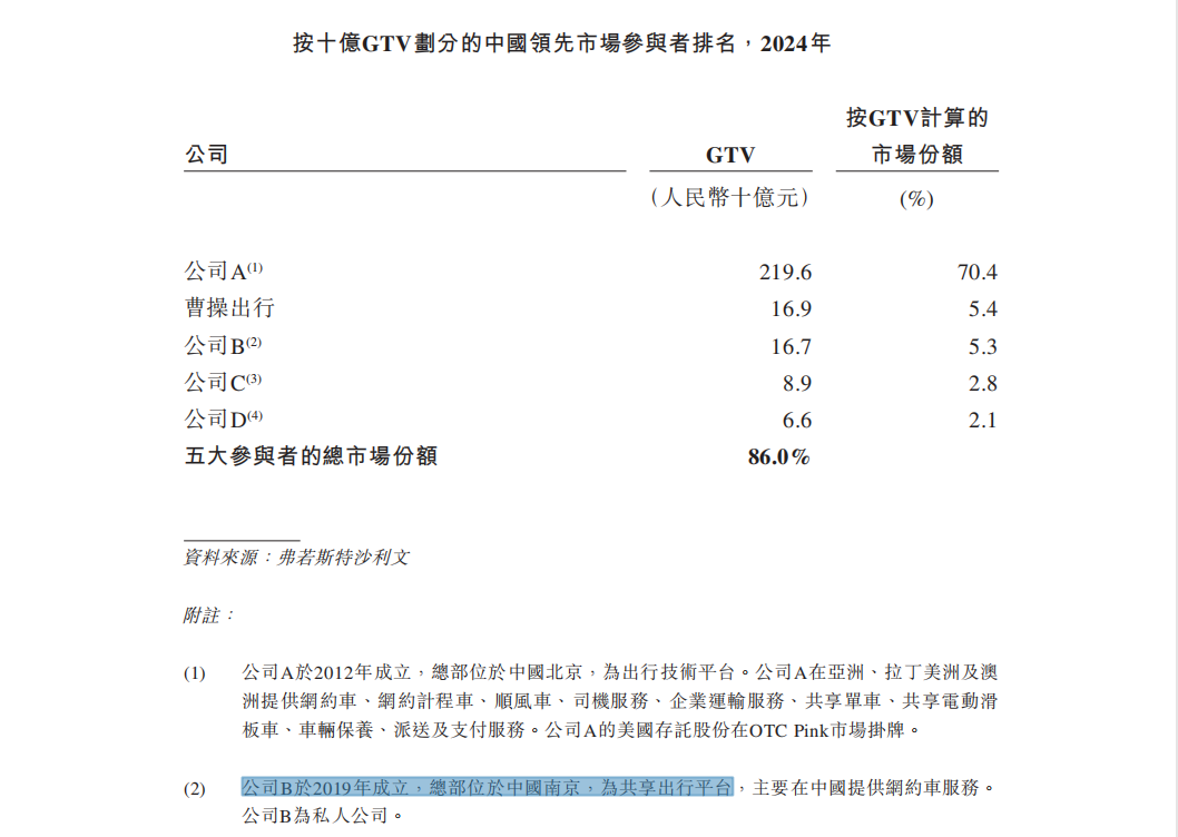 行业第二的曹操出行自创立后从未实现盈利,2021-2025年累计亏损近90亿元。在曹操出行招股书中,数据显示,公司在网约车行业市占率5.4%位于行业第二,而次于曹操出行位居第三的公司B,成立于2019年,总部位于南京市,2024年的GTV(总交易额)达到167亿元。恰好T3出行同样成立于2019年,总部地址也位于南京。