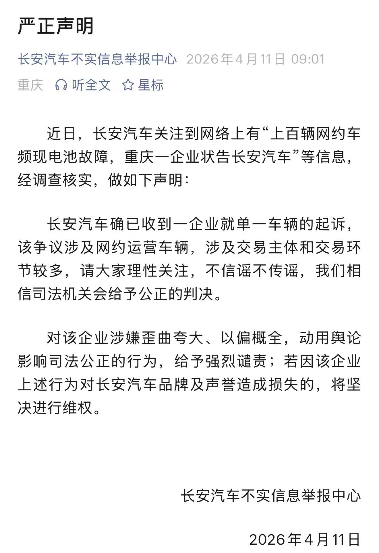 对于网上流传的“上百辆网约车频现电池故障,重庆一企业状告长安汽车”,长安汽车回应声明称,长安汽车收到起诉消息属实,但仅限于单一车辆起诉,与相关企业所称四百辆严重不符,并指相关企业存在夸大事实、干扰司法之嫌。