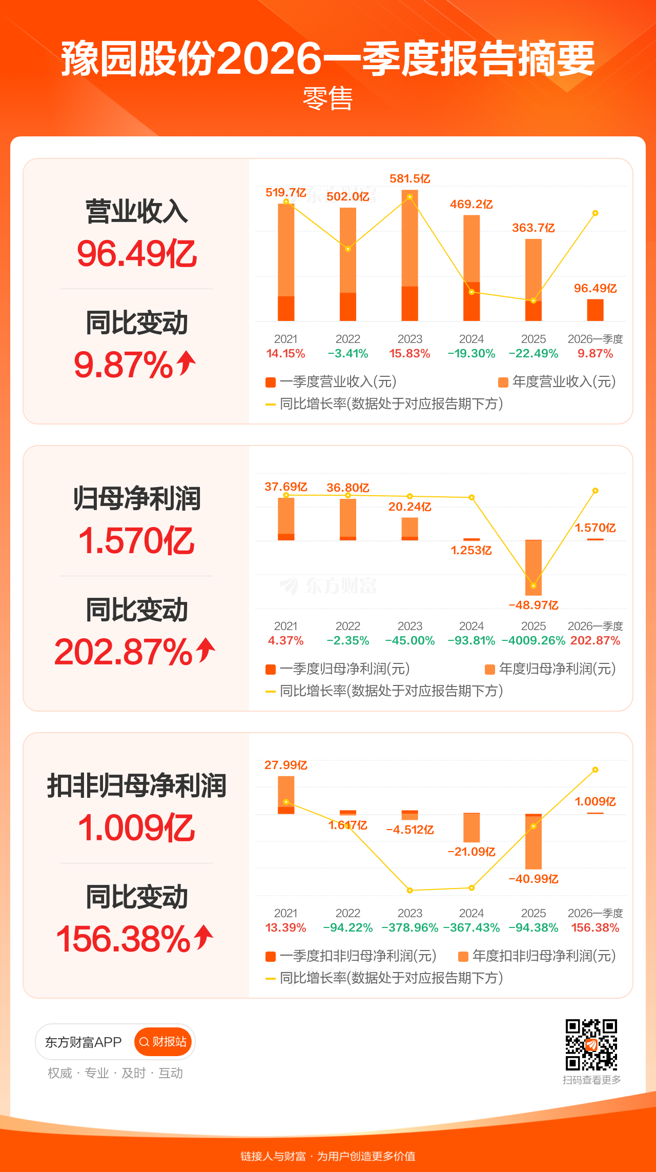 豫园股份4月17日发布2026年一季报显示,公司一季度实现营业收入96.49亿元,同比增长9.87%;归母净利润1.57亿元,同比增长202.87%;扣非归母净利润1.01亿元,同比增长156.38%。