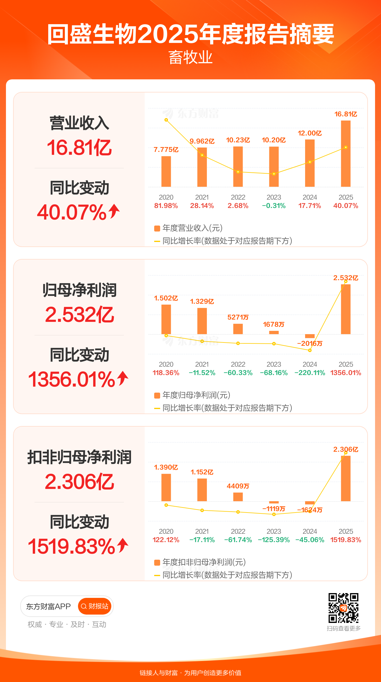 回盛生物4月17日发布2025年年报显示,公司全年实现营业收入16.81亿元,同比增长40.07%;归母净利润2.53亿元,同比增长1356.01%;扣非归母净利润2.31亿元,同比增长1519.83%。
