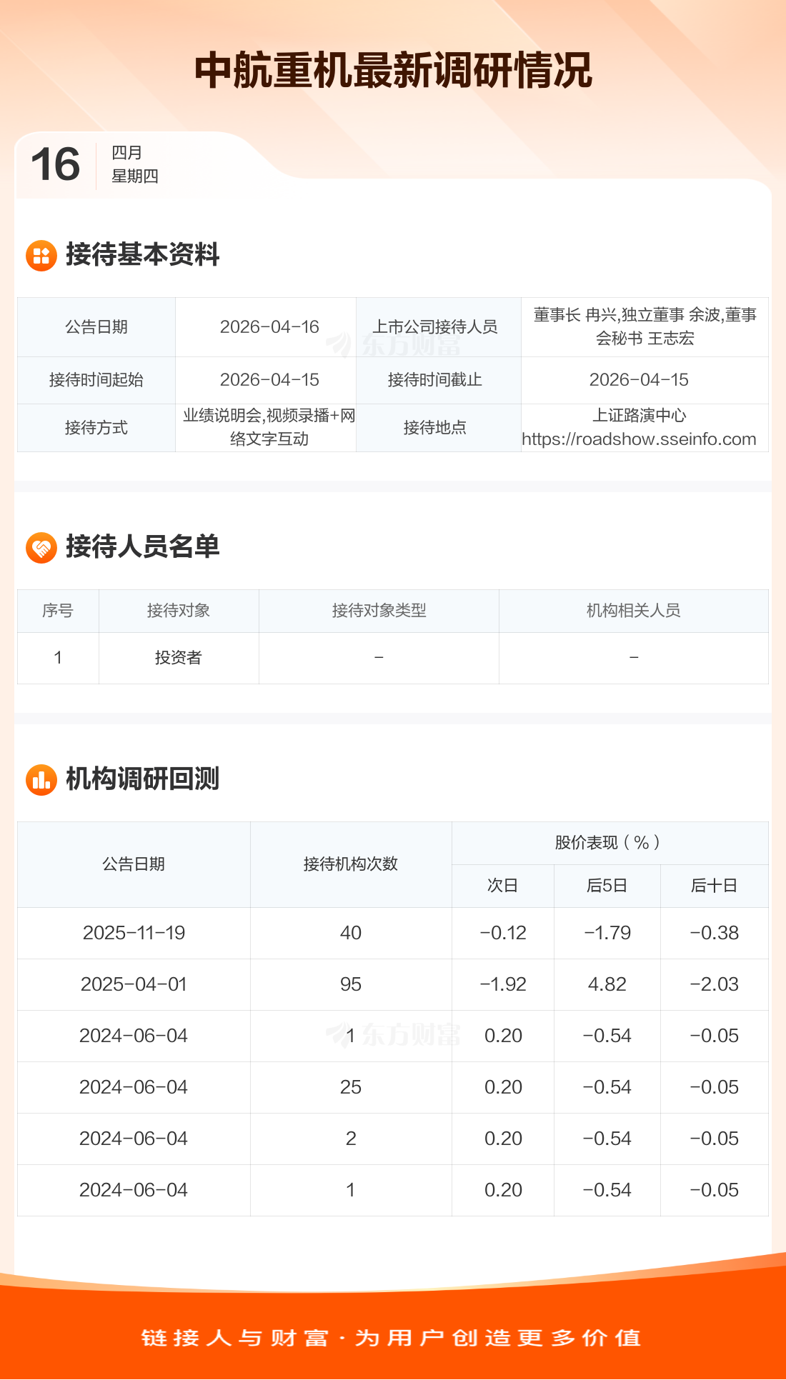 中航重机4月16日公告称,4月15日接待投资者调研。接待人员包括董事长 冉兴,独立董事 余波,董事会秘书 王志宏。