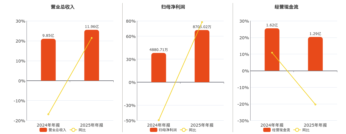 公司营业总收入为11.96亿元,较去年同报告期营业总收入增加2.11亿元,同比较去年同期上涨21.42%。归母净利润为8705.02万元,较去年同报告期归母净利润增加3824.31万元,同比较去年同期上涨78.36%。经营活动现金净流入为1.29亿元。