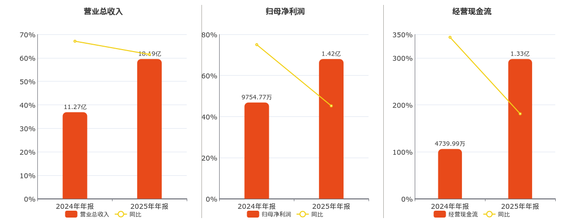 公司营业总收入为18.19亿元,较去年同报告期营业总收入增加6.92亿元,实现5年连续上涨,同比较去年同期上涨61.46%。归母净利润为1.42亿元,较去年同报告期归母净利润增加4410.30万元,实现3年连续上涨,同比较去年同期上涨45.21%。经营活动现金净流入为1.33亿元,较去年同报告期经营活动现金净流入增加8574.54万元,实现2年连续上涨,同比较去年同期上涨180.90%。