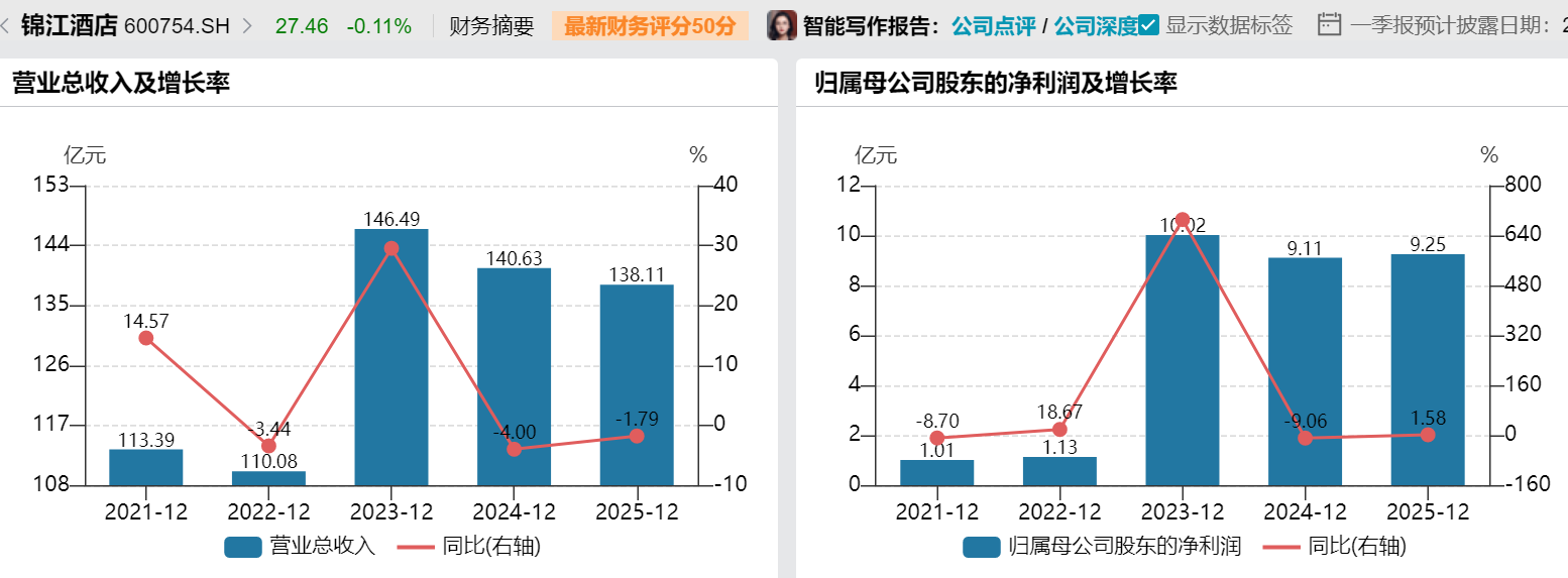 锦江酒店称,剔除2026年预计的资产组合,持续优化、退出低效业务后,公司预计2026年实现营收比上年增长4%-6%。