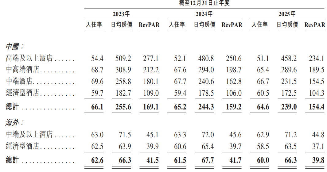麻烦的是,随着规模的扩张,锦江酒店旗下各条线酒店在OCC(入住率)、ADR(日均房价)、RevPAR(平均可出租客房收入)等方面均有所下降。该公司国内酒店板块2025年日均房价为239元,较2023年、2024年减少16.6元、5.3元;平均可出租客房收入154.4元,比2023年、2024年下降了14.7元、4.8元;入住率64.6%,此前两年分别是66.1%、65.2%。