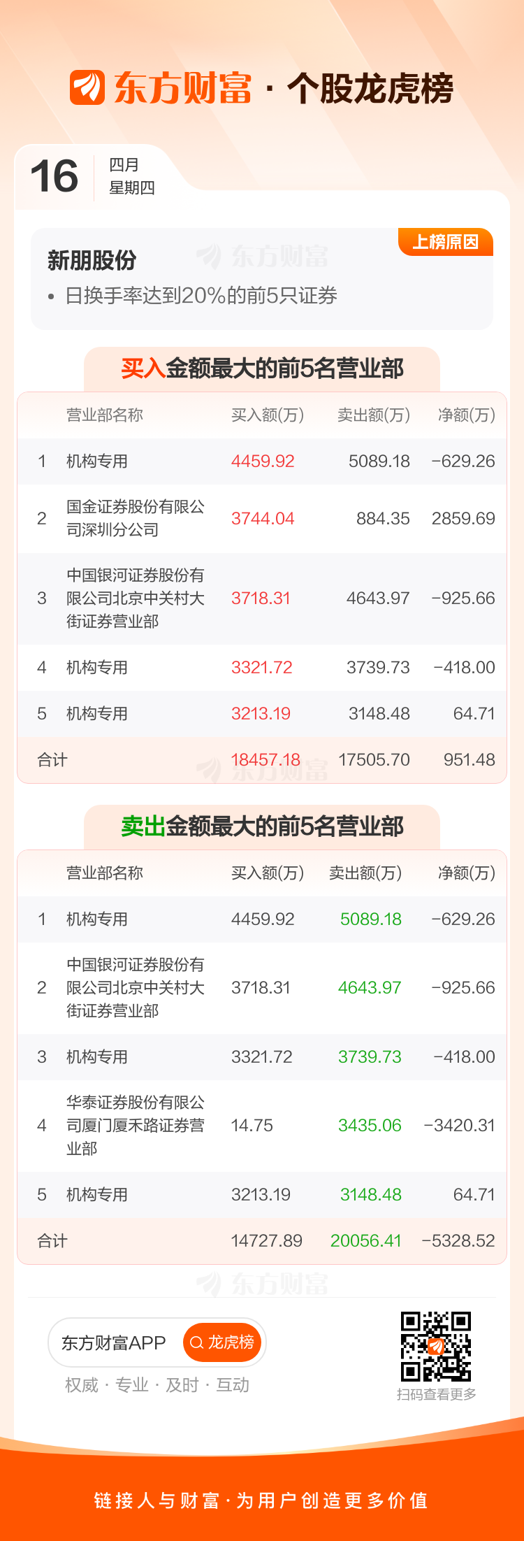 交易所2026年4月16日公布的交易公开信息显示,新朋股份因成为日换手率达到20%的前5只证券上榜。新朋股份当日收报13.4元,涨跌幅7.20%,偏离值33.16%,换手率33.16%,成交额24.92亿。