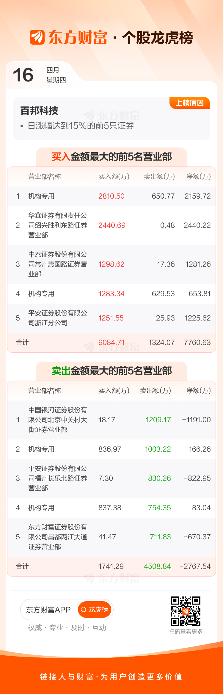交易所2026年4月16日公布的交易公开信息显示,百邦科技因成为日涨幅达到15%的前5只证券上榜。百邦科技当日收报23.78元,涨跌幅19.98%,偏离值20.00%,换手率18.70%,成交额5.21亿。