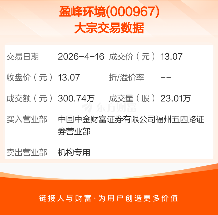 2026年4月16日,盈峰环境发生1笔大宗交易,共成交23.01万股,成交金额300.74万元。