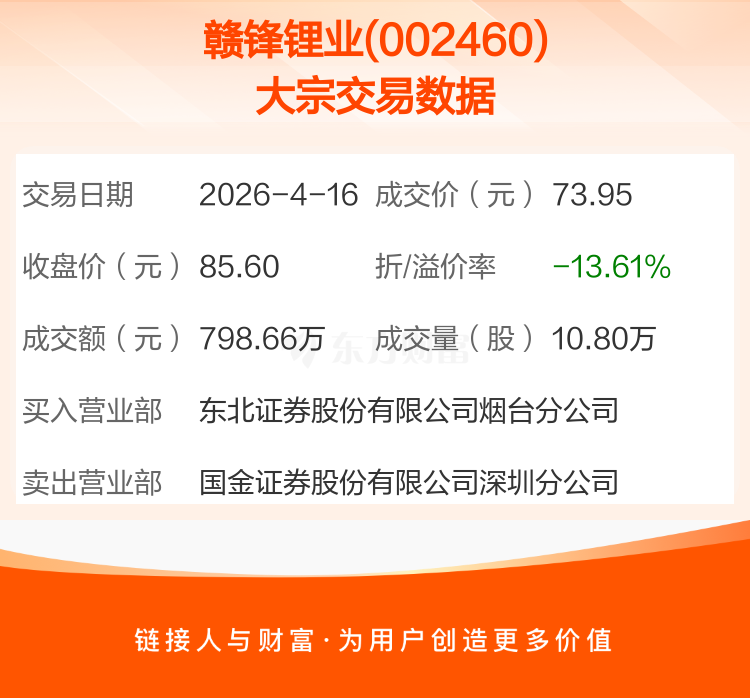 2026年4月16日,赣锋锂业发生1笔大宗交易,共成交10.80万股,成交金额798.66万元。