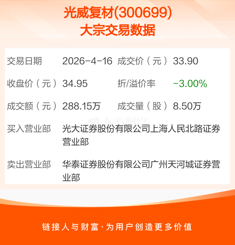 2026年4月16日,光威复材发生1笔大宗交易,共成交8.50万股,成交金额288.15万元,占其流通市值比例为0.01%。