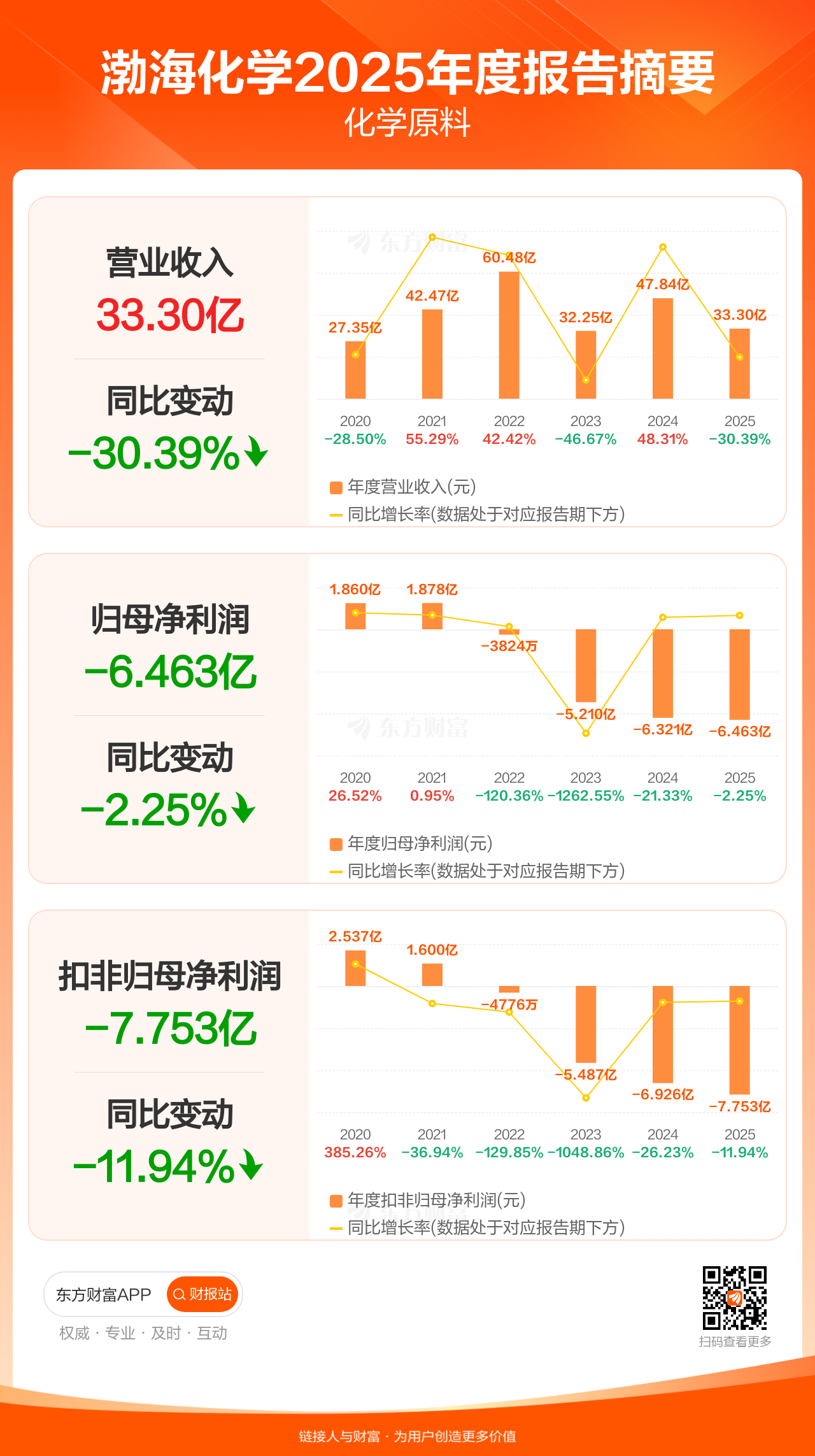 渤海化学4月17日发布2025年年报显示,公司全年实现营业收入33.30亿元,同比下滑30.39%;归母净利润-6.46亿元;扣非归母净利润-7.75亿元。