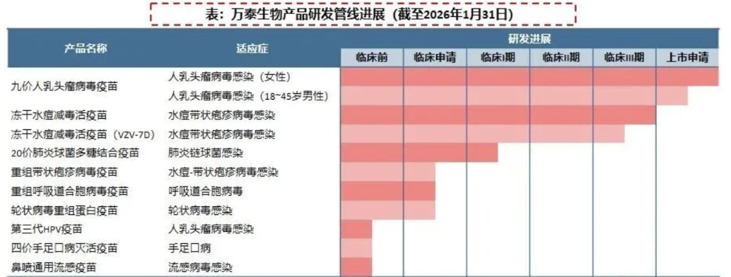 被养生堂购入后,万泰生物也成为厦大团队研究成果转化、生产制造和市场销售的主要合作平台。时至今日,万泰生物已积累深厚研发底蕴和成熟的“产学研销”转化模式,核心研发管线多元:HPV疫苗领域,二十价HPV疫苗处于研发推进阶段,九价HPV疫苗男性III期临床试验已启动并完成首例受试者入组;其他疫苗领域,冻干水痘减毒活疫苗已启动III期临床试验并完成首例受试者入组,重组呼吸道合胞病毒疫苗正等待临床试验批准。
