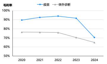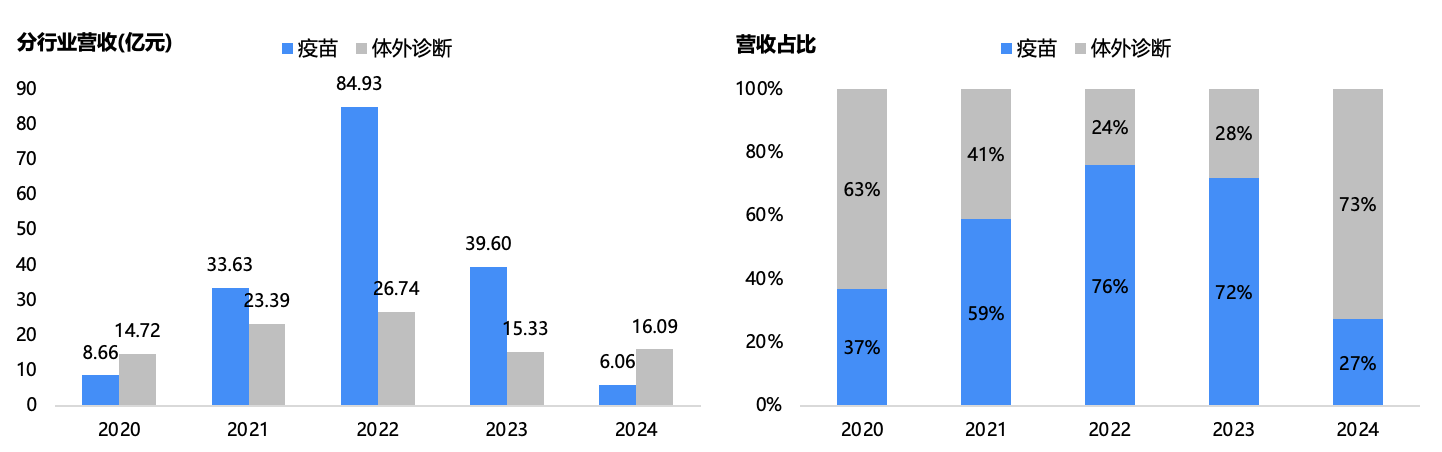 相较之下,公司体外诊断业务波动相对较小,疫苗业务在2023-2024年大幅缩水后,体外诊断业务2024年重新成为公司收入核心来源,占比73%。