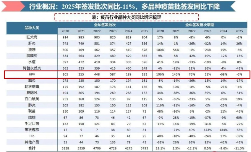 市场需求的放缓也直观体现在批签发数据上。中信建投(601066.SH)研报显示,2025年疫苗行业整体批签发次数为3793批次,同比下降11.3%;其中,HPV疫苗签发批次继续下降,增速为-3%,较上年的-68%有所收窄。