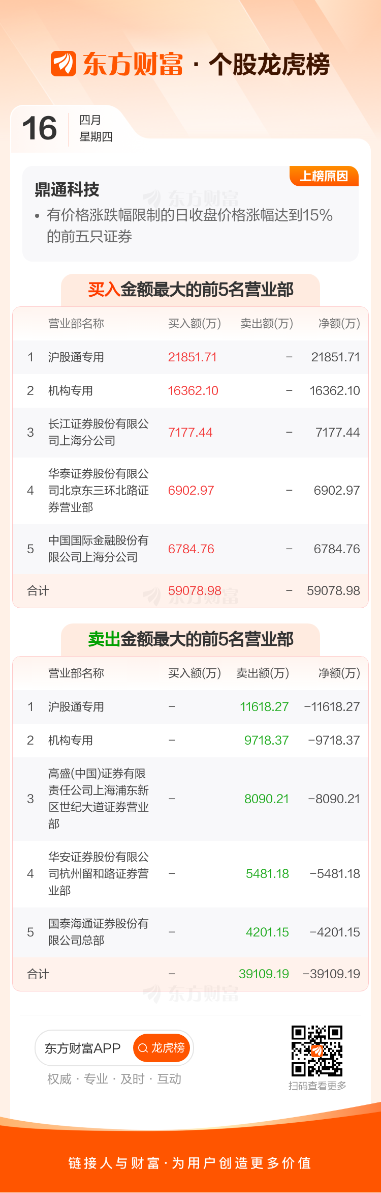 交易所2026年4月16日公布的交易公开信息显示,鼎通科技因成为有价格涨跌幅限制的日收盘价格涨幅达到15%的前五只证券上榜。鼎通科技当日收报207.23元,涨跌幅20.00%,偏离值20.00%,换手率9.46%,成交额25.88亿。