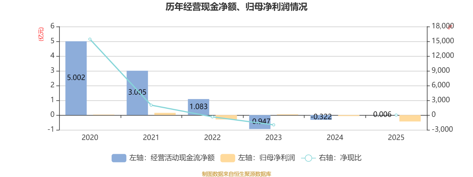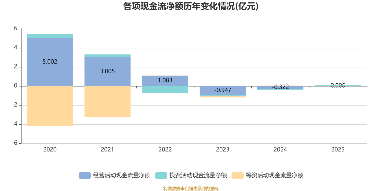 2025年,公司经营活动现金流净额为64.1万元,同比增加3288.6万元;筹资活动现金流净额-131.2万元,同比减少475.8万元;投资活动现金流净额695.6万元,上年同期为-738.7万元。