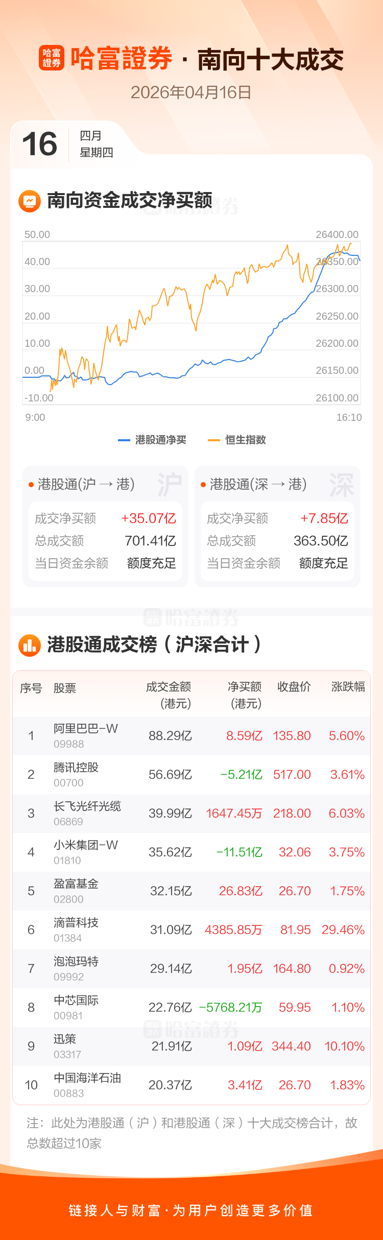 恒生指数4月16日涨1.72%,收报26394.26点。南向资金今日净买入港股42.91亿港元。南向资金今日成交额1064.92亿港元,港股大市成交2562.28亿港元。