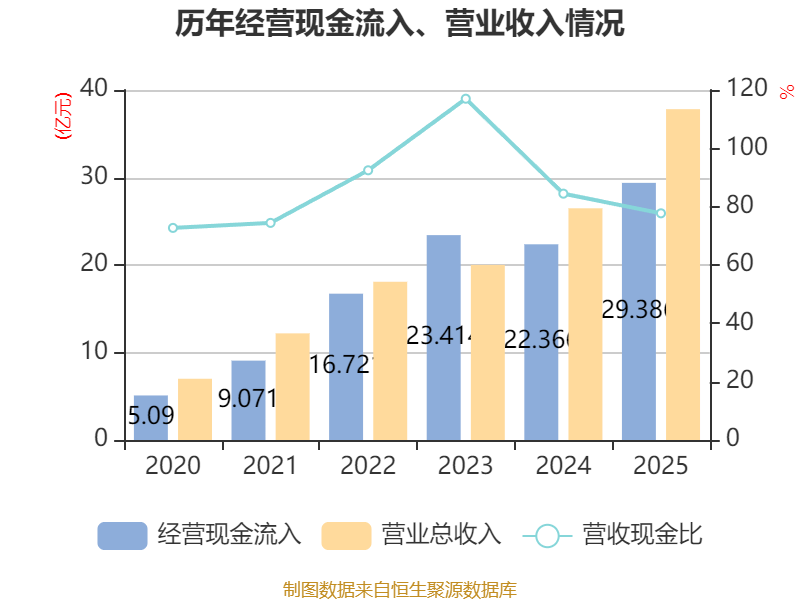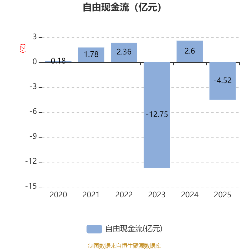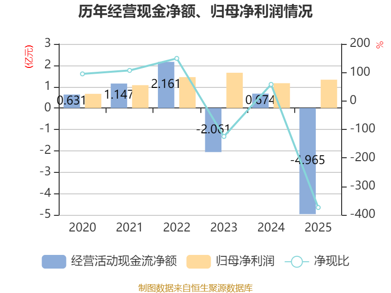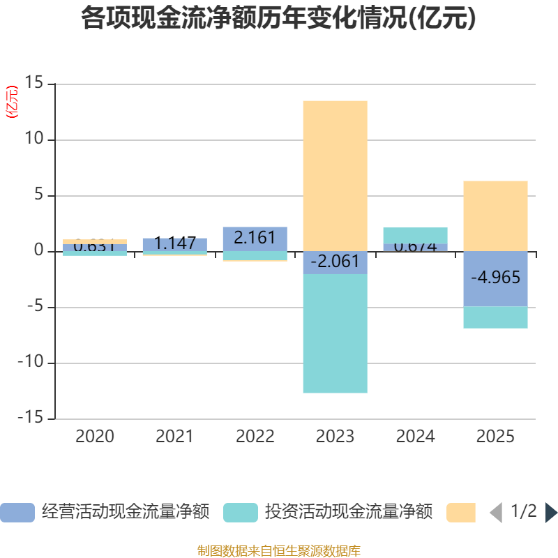 截至2025年,公司经营活动现金流净额为-4.97亿元,同比减少5.64亿元;筹资活动现金流净额6.28亿元,同比增加6.3亿元;投资活动现金流净额-1.96亿元,上年同期为1.45亿元。