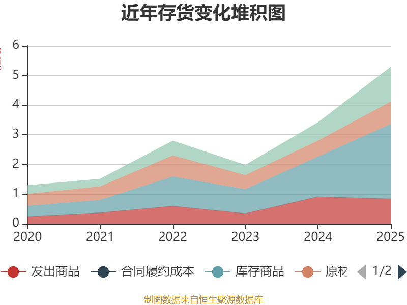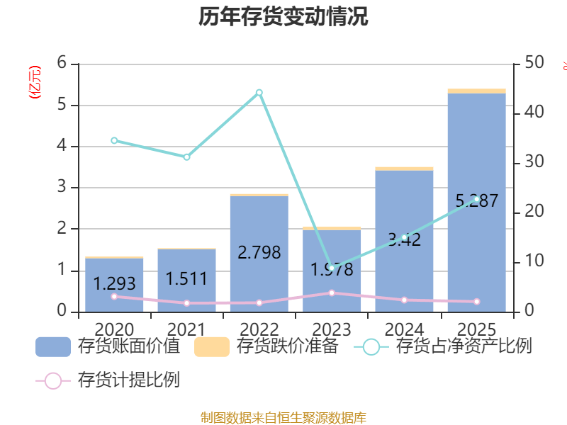 从存货变动来看,截至2025年末,公司存货账面价值为5.29亿元,占净资产的22.69%,较上年末增加1.87亿元。其中,存货跌价准备为1093.8万元,计提比例为2.03%。