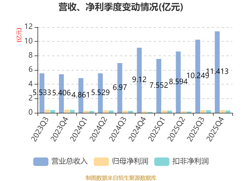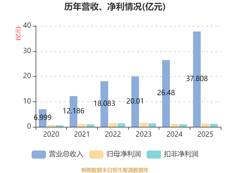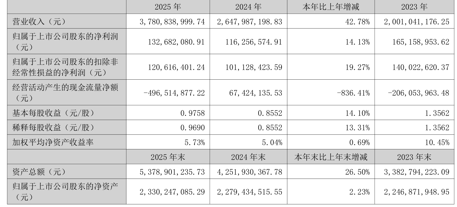 中证智能财讯鑫宏业(301310)4月17日披露2025年年度报告。2025年,公司实现营业总收入37.81亿元,同比增长42.78%;归母净利润1.33亿元,同比增长14.13%;扣非净利润1.21亿元,同比增长19.27%;经营活动产生的现金流量净额为-4.97亿元,上年同期为6742.41万元;报告期内,鑫宏业基本每股收益为0.9758元,加权平均净资产收益率为5.73%。公司2025年度分配预案为:拟向全体股东每10股转4股,派现2.5元(含税)。