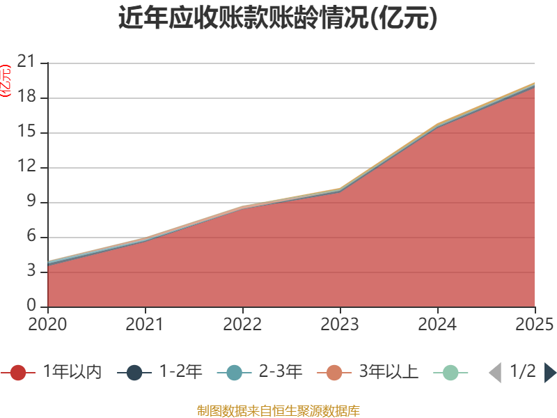 从应收账款账龄结构来看,截至2025年末,公司账龄在1年以内的应收账款余额为18.83亿元,较上年末增长3.49亿元,占应收账款总额比例为97.56%,较上年末上升0.21个百分点。