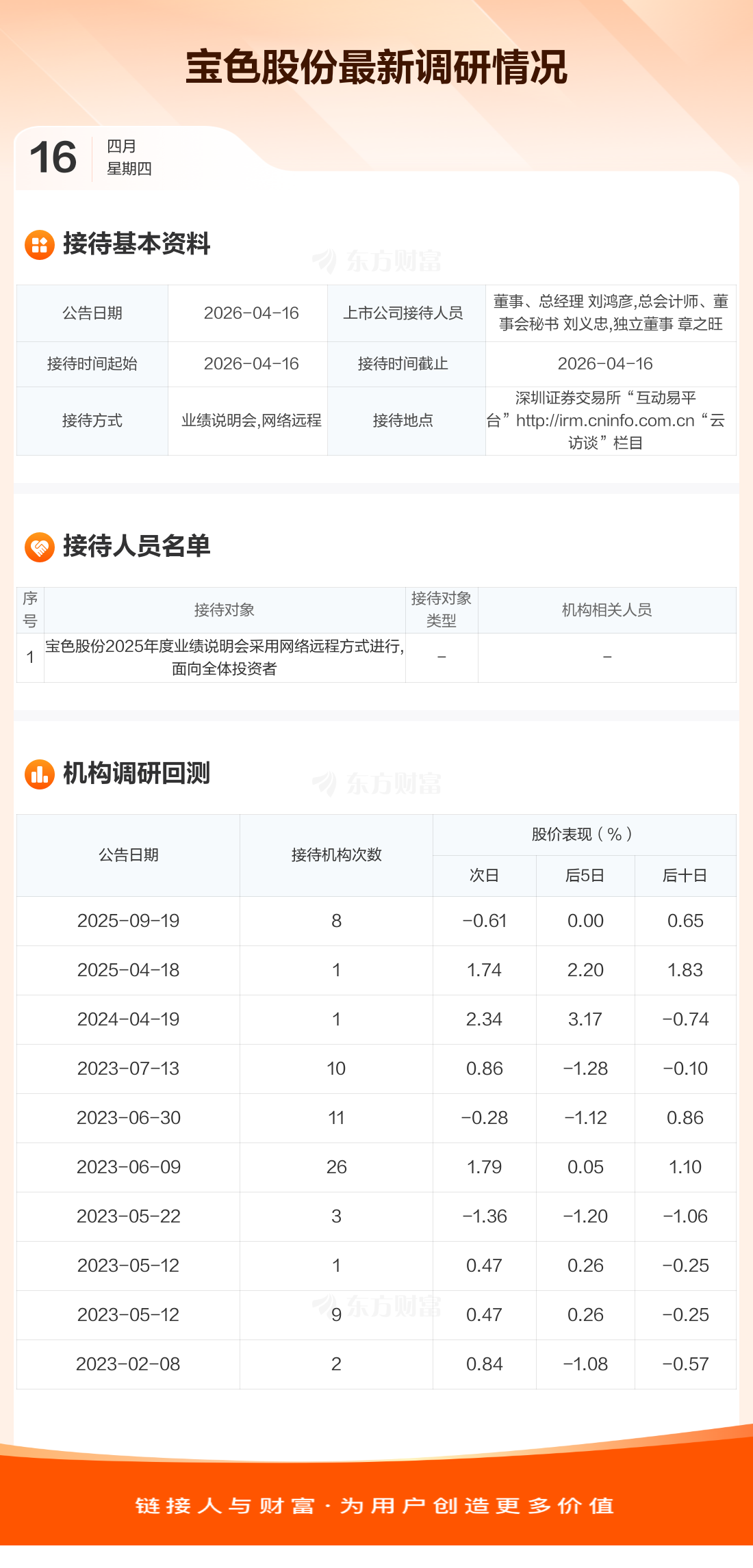 宝色股份4月16日公告称,4月16日接待宝色股份2025年度业绩说明会采用网络远程方式进行,面向全体投资者调研。接待人员包括董事、总经理 刘鸿彦,总会计师、董事会秘书 刘义忠,独立董事 章之旺。