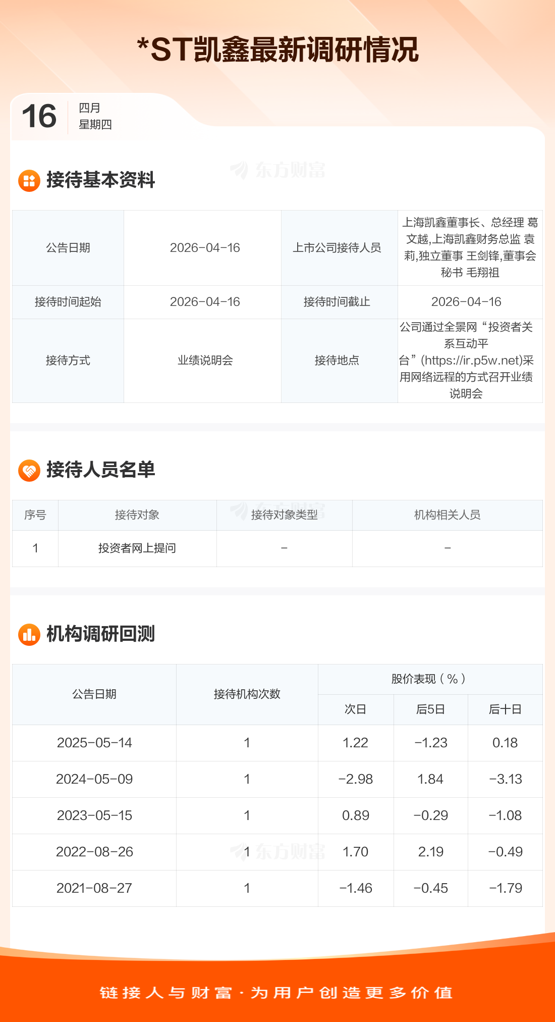 *ST凯鑫4月16日公告称,4月16日接待投资者网上提问调研。接待人员包括上海凯鑫董事长、总经理 葛文越,上海凯鑫财务总监 袁莉,独立董事 王剑锋,董事会秘书 毛翔祖。